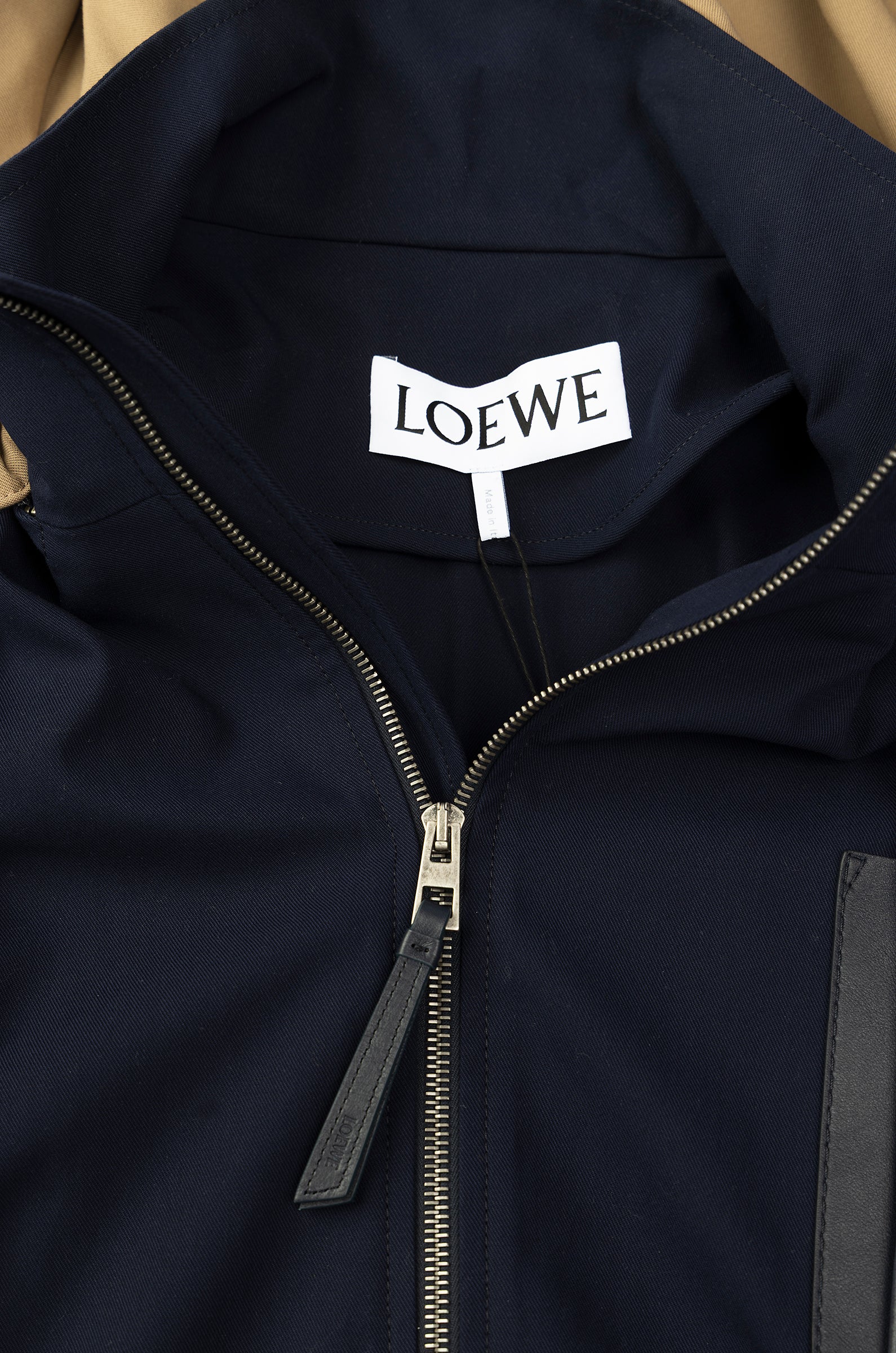 Loewe’s cotton hooded jacket blends utility with craft: clean lines, subtle color-blocking, and a lightweight hand that moves easily through seasons. The navy/beige palette keeps it understated while signature finishing elevates the everyday profile.
